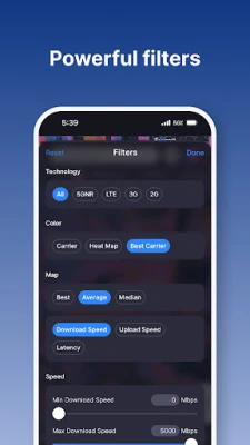 • Powerful filters: filter by carrier, LTE/5G, download speeds, upload speeds, or see your speed tests only
