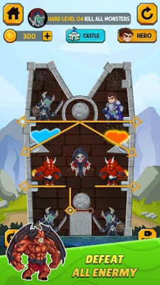 Solve puzzles and rescue the hero, collect all the treasures, kill monsters, and save the princess. Pull the pin to destroy your enemies by pulling lava and poisonous gas into their puzzle units. Cut the ropes to rescue the princess from the scary monsters.