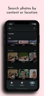 You can search both by content (selfie, smile, vacation, fun, etc.) and by location (London, Istanbul, etc.) with the advanced photo search feature.